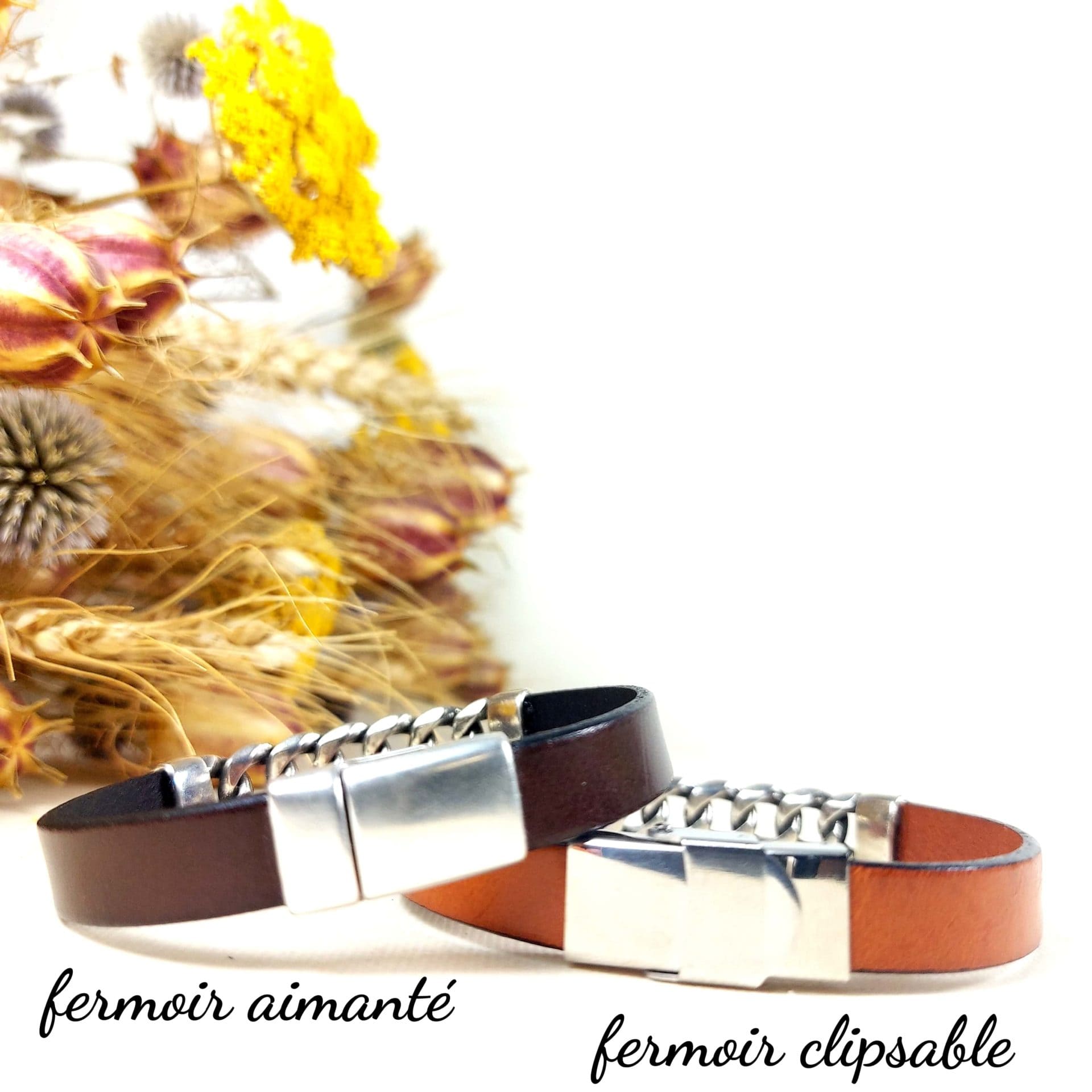 Tous les éléments de ce bracelet (cuir, fermoir, maillons) sont fabriqués en Europe. J’assemble chaque pièce à la main, dans mon atelier en Deux-Sèvres, selon vos choix de couleur, de fermoir et de taille.