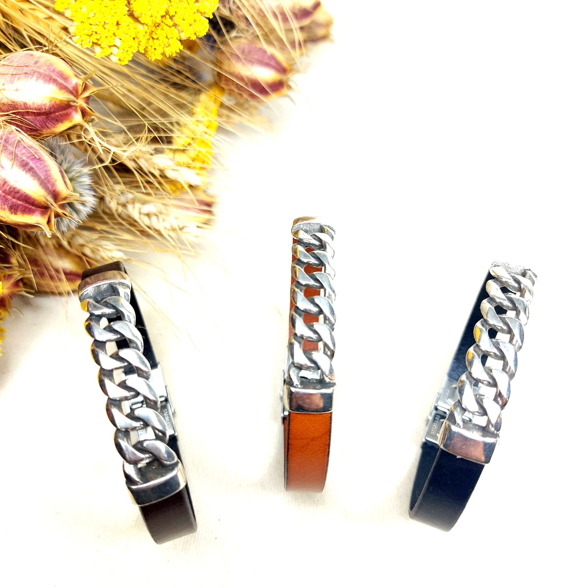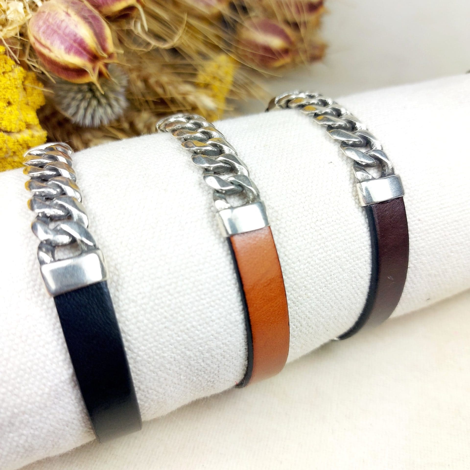 Bracelet cuir gourmette pour homme : élégance et simplicité en 3 coloris. Le mariage parfait entre métal et cuir ! A découvrir de toute urgence.