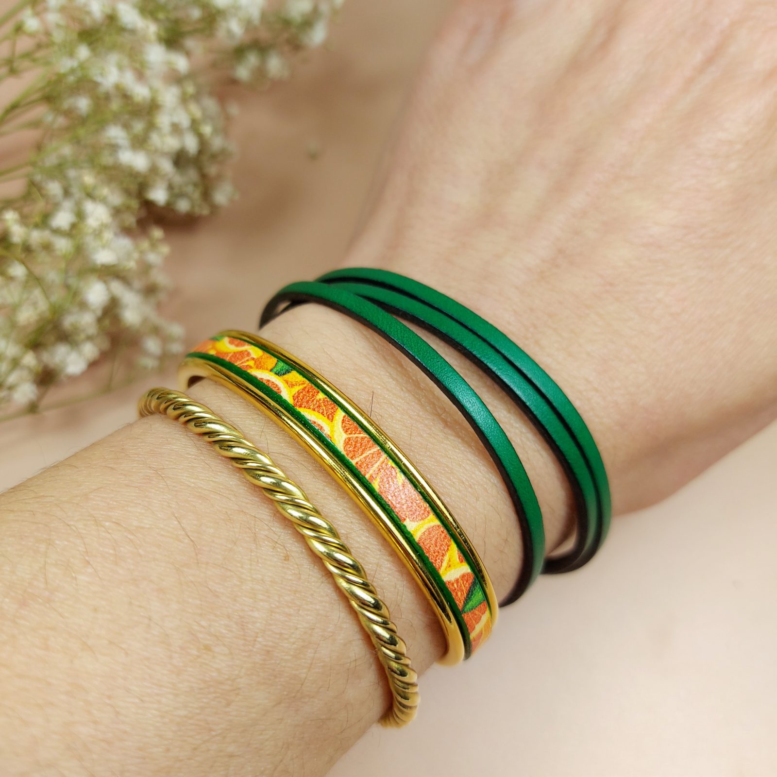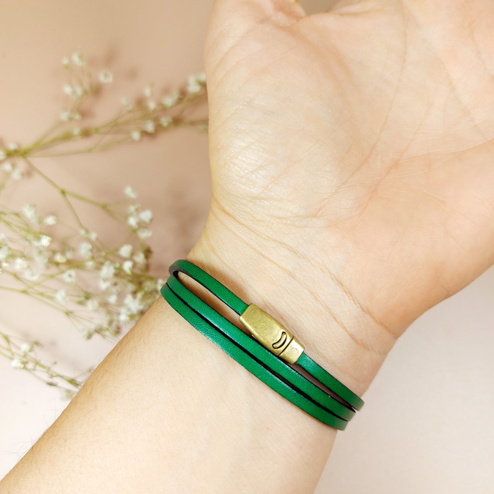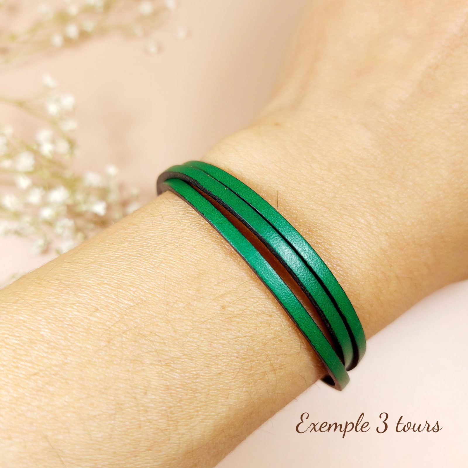 Bracelet multirang en cuir vert. Réalisé sur-mesure pour un ajustement parfait à votre poignet, nombre de tours au choix.