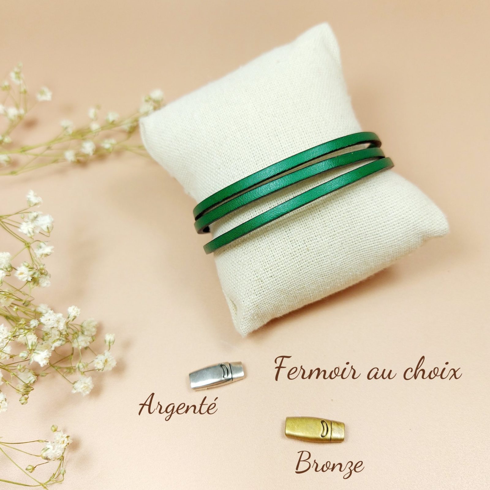 Succombez au charme de ce bracelet vert en cuir multirang, fabriqué avec soin dans mon atelier en Deux-Sèvres.