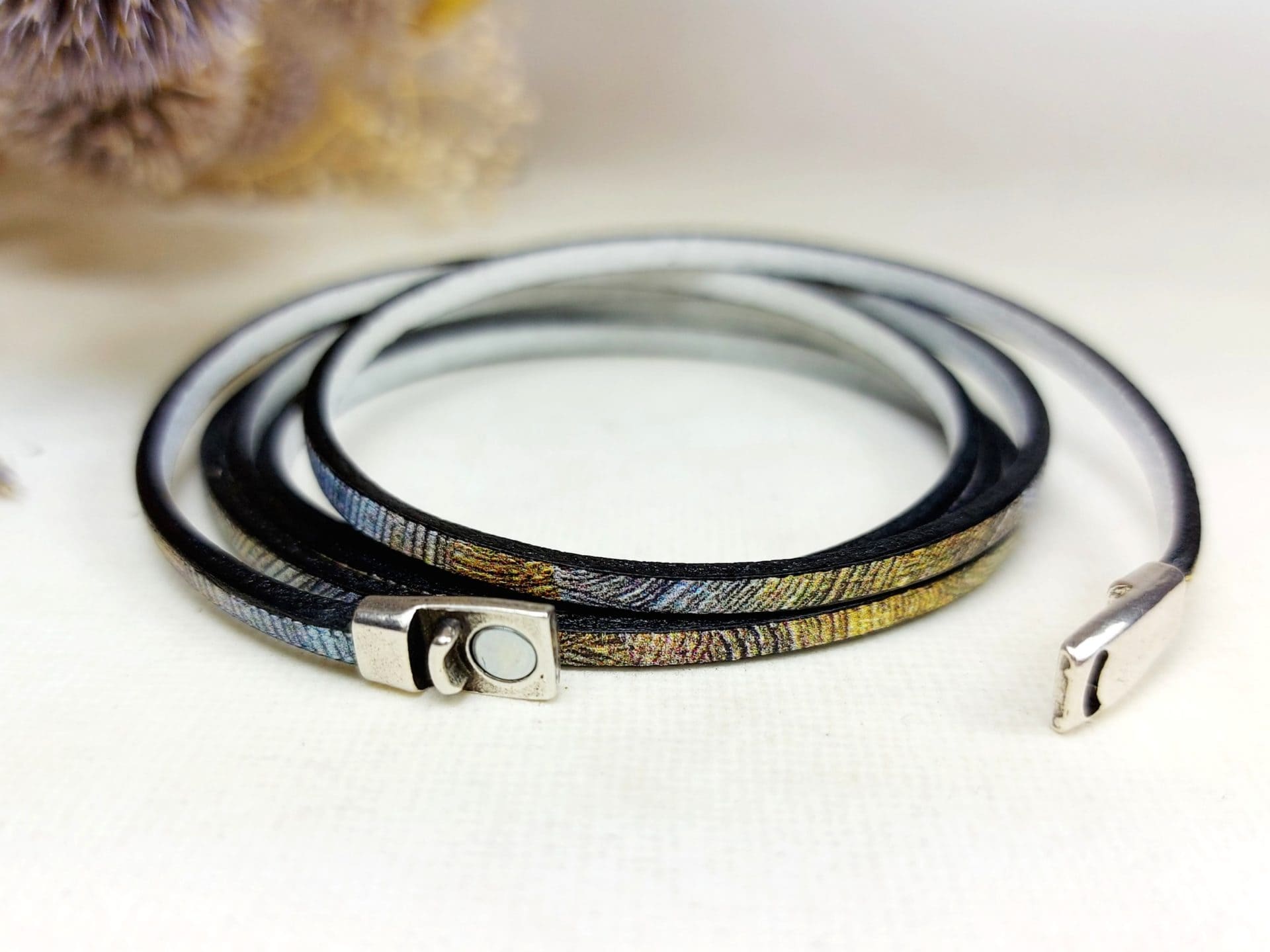 Bracelet multirang artisanal en cuir pour femme réalisé sur-mesure. Une association de couleurs toutes douces qui habillera parfaitement votre poignet ! A vous de choisir le nombre de tours que vous souhaitez : 1, 2 , 3, 4 ou 5 (sur la photo, c'est un 5 tours).