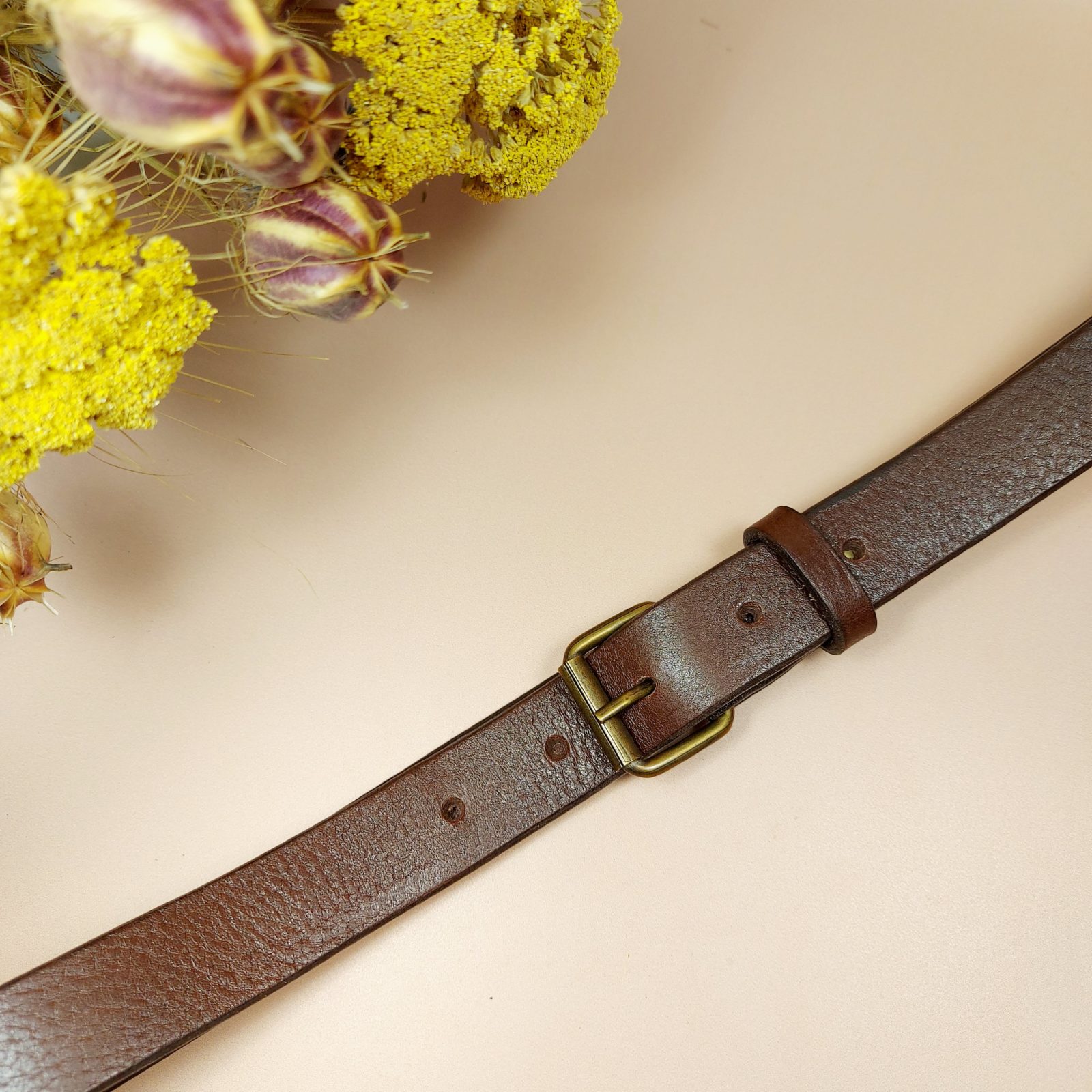 Apportez une touche authentique à votre tenue avec notre ceinture artisanale en cuir marron et sa boucle rouleau. Fabriquée à la main en Deux-Sèvres.