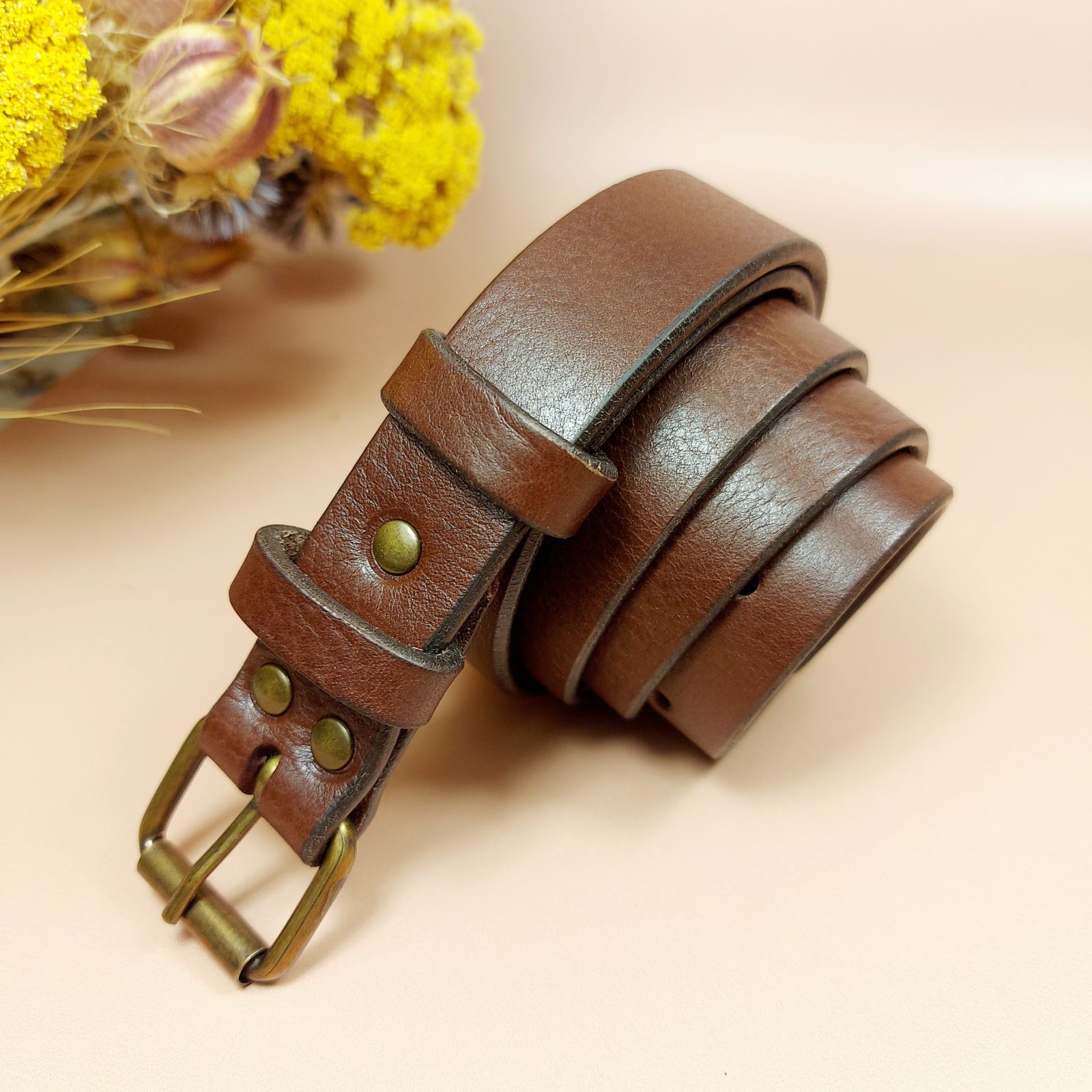 Ceinture artisanale en cuir marron boucle rouleau