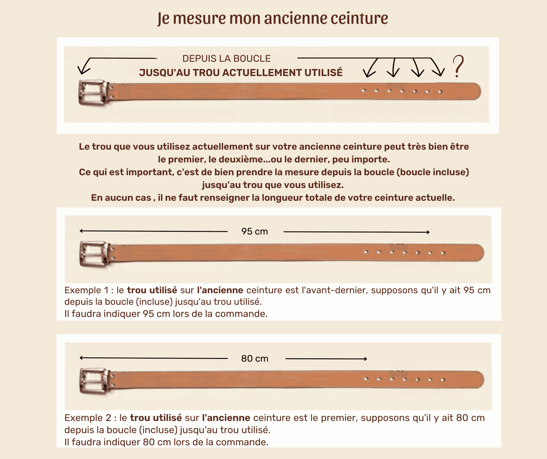 NON, la longueur à communiquer N’EST PAS la longueur totale d’une de vos ceintures actuelles. C’est la distance entre la boucle (boucle incluse) et le trou que vous utilisez actuellement sur une de vos ceintures qu’il faut renseigner (voir photo explicative). En cas de doute, consultez le guide « comment bien mesurer ma ceinture ? » ou contactez-moi directement afin que je puisse vous aider.