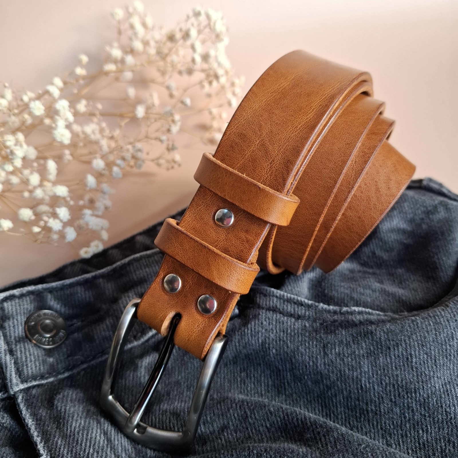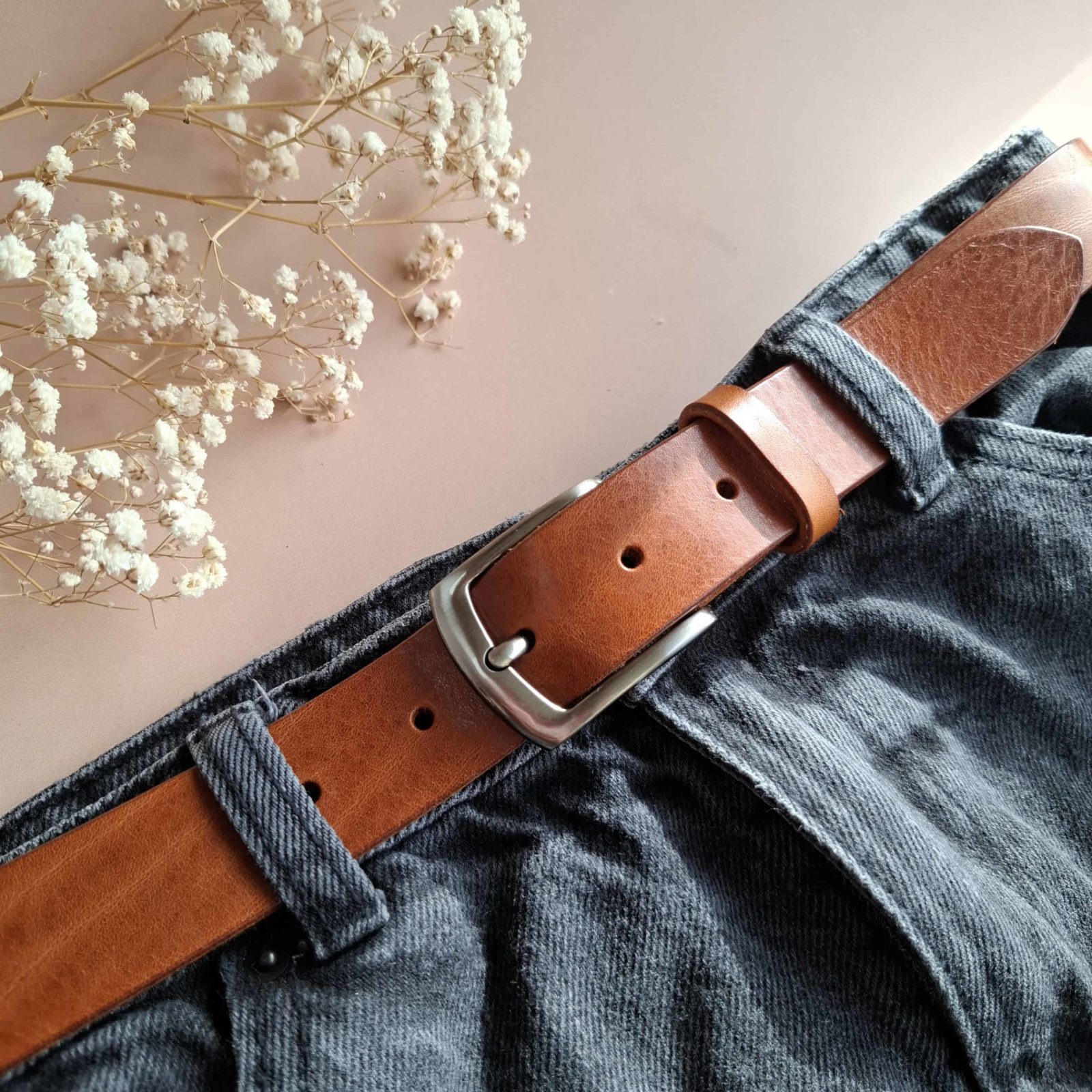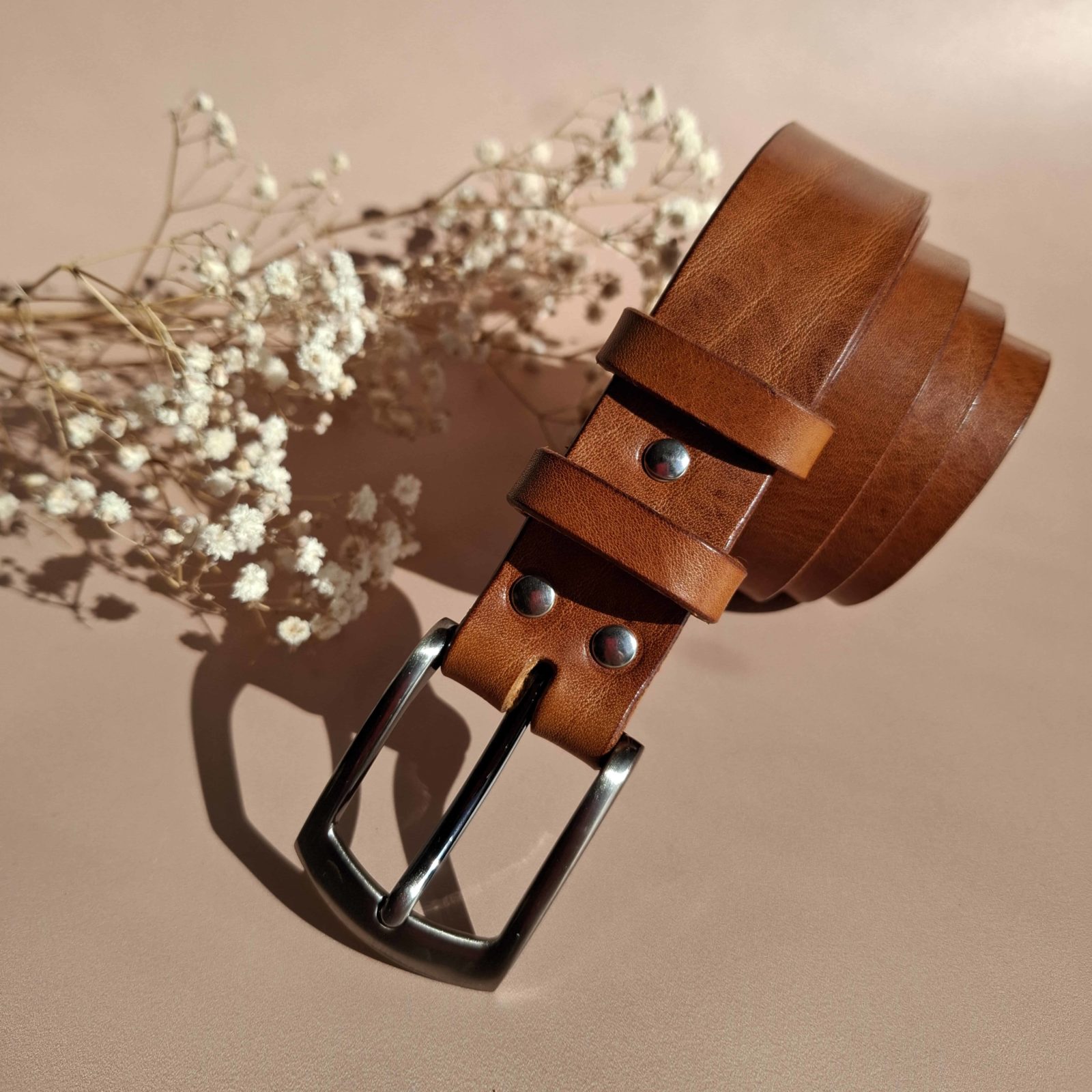 Ceinture artisanale en cuir camel, 3 cm de largeur et 4 mm d’épaisseur. Enfin une ceinture qui dure.
