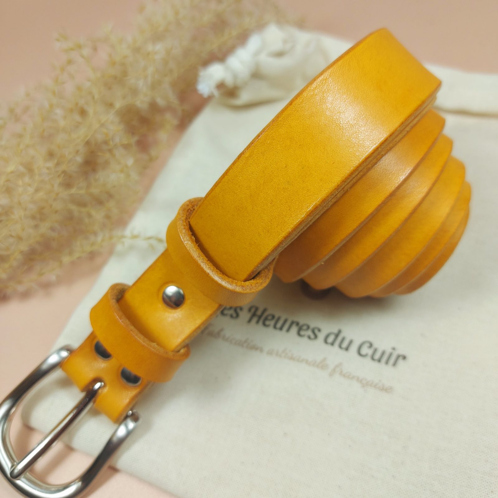 Démarquez-vous avec une ceinture en cuir jaune, réalisée sur-mesure en France. 🇫🇷 Idée cadeau durable et éthique.