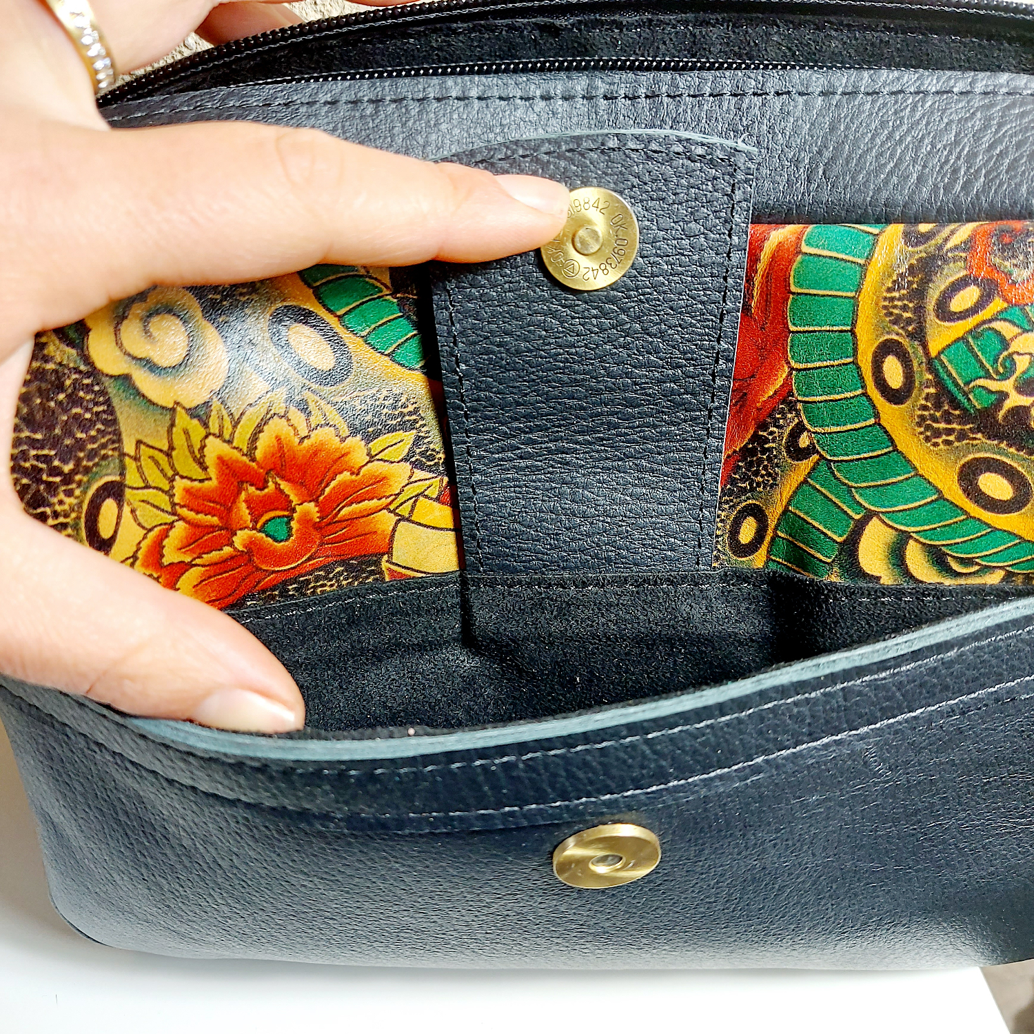 Découvrez ce magnifique sac à main en cuir façon « trotteur ». Pièce unique, motif tatouage, disponible dès maintenant.